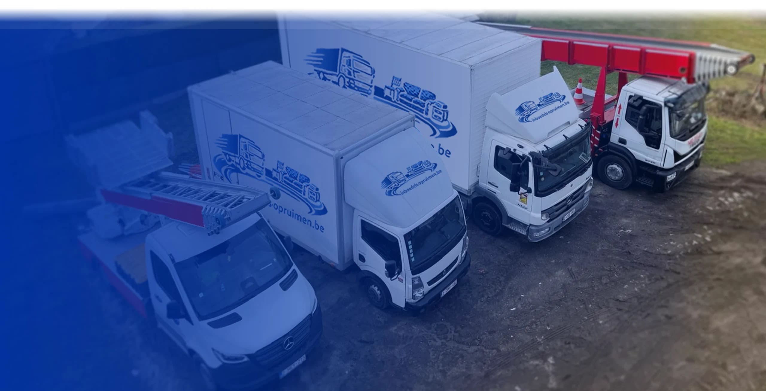 We werken met bakwagens, platte vrachtwagens en bestelwagens van 3,5 tot 7,5 ton. Residentiële opruimingen vereisen gemiddeld 1 tot 3 ladingen, grote inboedelopruimingen 4 tot 8 ladingen. Afvoer verloopt via OVAM-erkende faciliteiten met volledige afvalstoffenregisterdocumentatie.